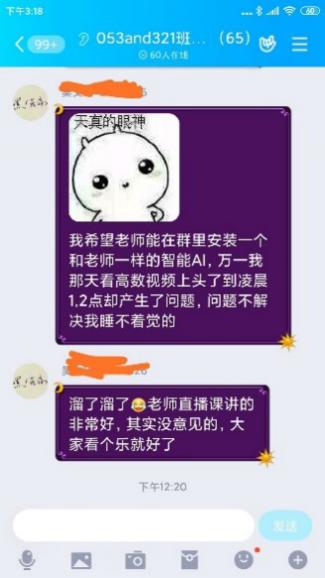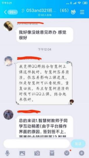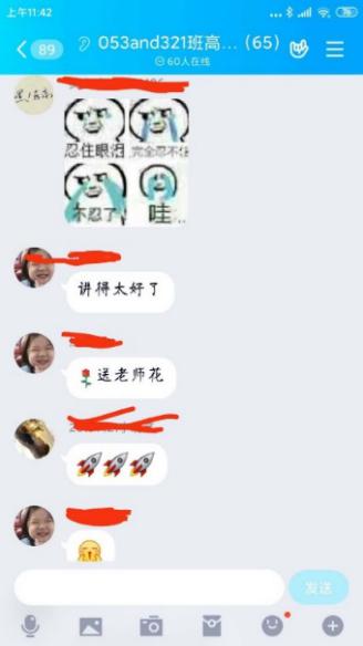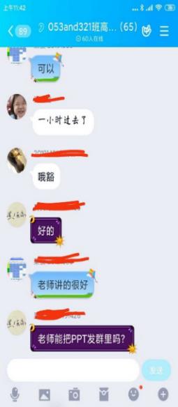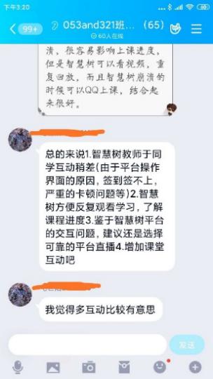 直播过程中,宋老师会先简单重述一下知识点,然后针对这个知识点做练习,做测试和学生互动。她采用的方式是:选用QQ群分享屏幕直播,在智慧树平台互动,比如抢答,随机点名回答,投票选择或者判断,头脑风暴环节让学生把做题的步骤拍照上传,实时看学生的掌握的情况,便于及时调节上课的节奏。在这个过程中,学生也可以随时在群里提出自己的疑问或者开麦和宋老师对话。因为随时都可能会被随机点名回答问题,学生注意力也比较集中,参与的热情也很高,学生感叹,直播不知不觉一个小时就过去了。