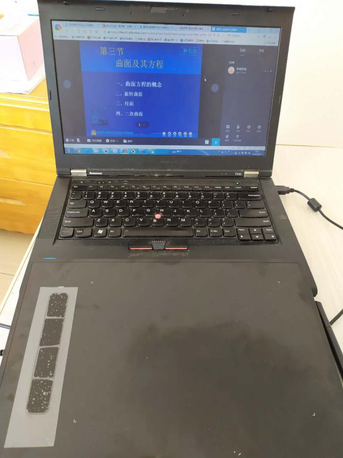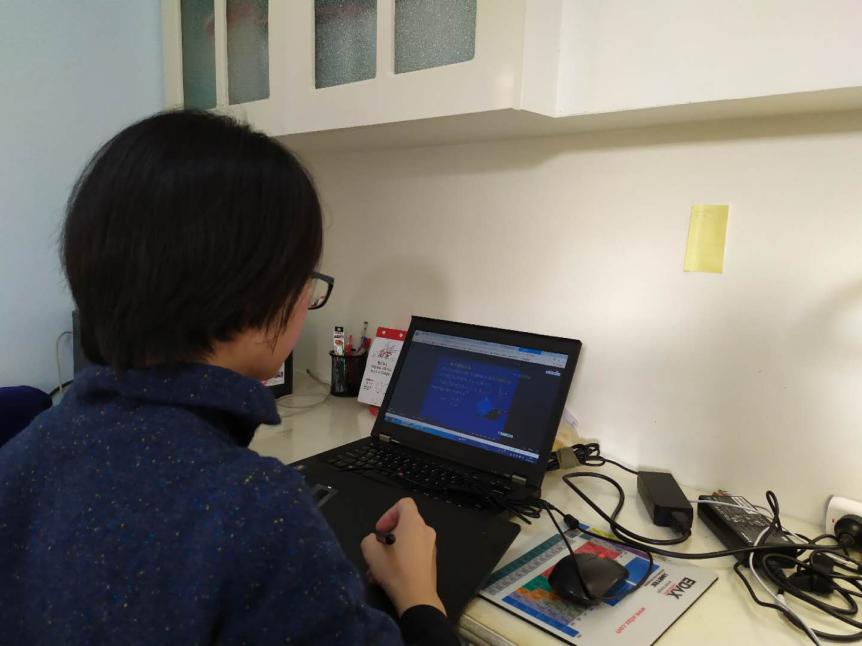 线下课堂中,数学这门课的板书非常重要,很多数学公式、定理的推导都要靠板书体现出来。但是线上教学,怎么板书数学的公式、符号、以及立体图形呢?针对这个问题,刘老师在咨询同事之后,立马买了一个超大的手写板,用分享屏幕的方式在线直播解题步骤,讲解知识点,给学生最直观的教学现场。
