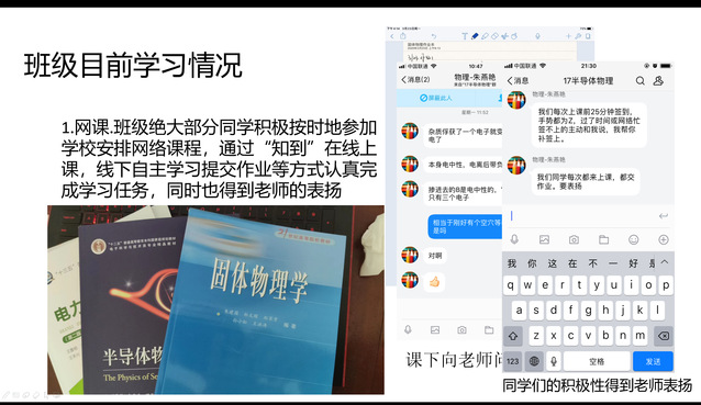 会上,刘岩枫从学生构成、获得荣誉、学分绩分布、欠学分情况等方面进行了班级介绍,结合大三年级特点,分享了班内学生的就业意向统计及职业困惑,并对疫情期间同学们在网课学习及生活近况中存在的困难进行调研与指导。