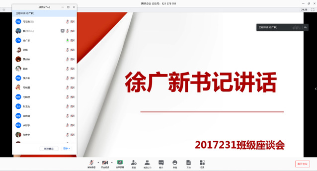 3月27日下午,我院党委书记徐广新在“腾讯会议”线上平台与所联系的2应用物理学2017231班全体学生召开了以“同心战‘疫’——我们在行动”主题班会,辅导员陈毓参加会议。会议由班级团支书刘岩枫主持。