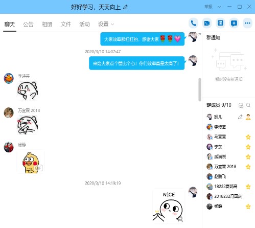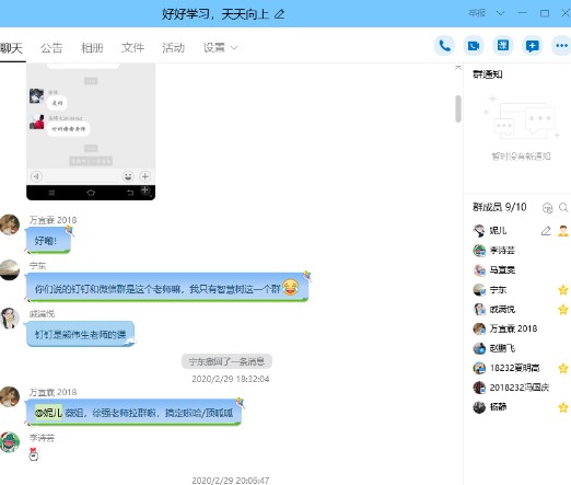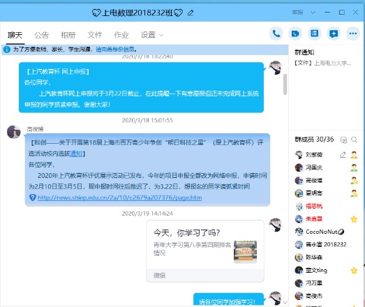 由于网课的形式多样化,大家一时间较难适应,所以会不习惯签到、交线上作业等教学活动,而且由于没有身边其他同学的带动,线上学习会因为自己不强的自控力而导致效率低下。宁东、姚瑜韬、付佳鑫等同学在了解到同学们的需求后,为了提高同学们的学习效率、更好地进行教学和学习工作,他们会主动每天定时定点在班级群中提醒大家签到,交作业,参加线上考试,完成预习任务等等,很大程度上调动了同学们的学习积极性。
