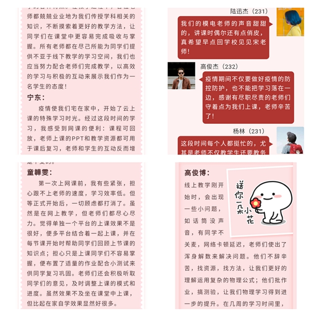 在线上教学中,同学们反馈同学之间、师生之间无法像线下教学那样达到及时、高效的交流。但几百甚至几千公里的距离无法阻隔同学们紧紧相连的心,大家仿佛一个共同体,每个人的生活都彼此关联。班干部们更是以身作则,尽职尽责地做好班级工作,完美地诠释着班委的带头作用。