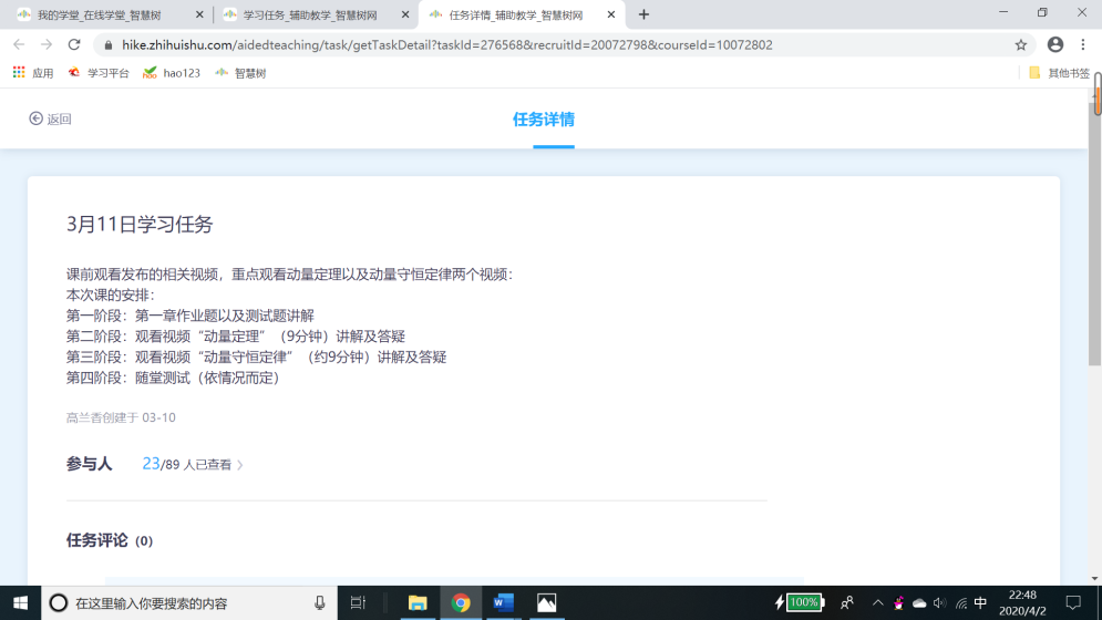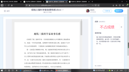 支部党员蒋秀丽同志开展线上教学,不忘开展课程思政。教学平台试用期,蒋老师为同学们选择了视频“科学家的故事—钱三强”,同学们可以自愿提交观后感,绝大部分同学积极提交了观后感,蒋老师一一评阅,和学生谈心。同学们纷纷表示要继承与发扬钱三强精神,为祖国的伟大复兴而努力学习,功成不必在我,功成必定有我。