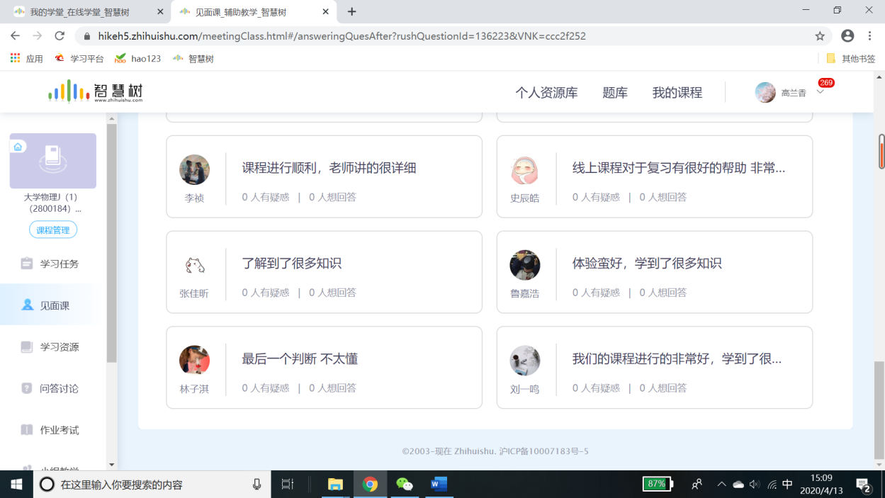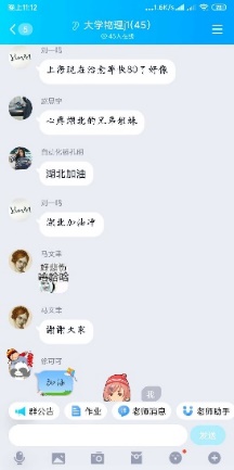 高兰香同志,考虑到师生不能见面,在开学第一课,首先自我介绍,并介绍了上海、学校及学院新冠疫情防控情况与措施。随后,让同学们自我介绍,并谈一谈自己在疫情期间的感受,以及家乡新冠疫情防控情况。当湖北的一位同学现身谈到湖北的现状时,同学们满屏简短地加油鼓劲,是他们发自内心对湖北的关切,对湖北同学的关心,简单朴实的话语折射出学子们心中有国,有家,有大爱。