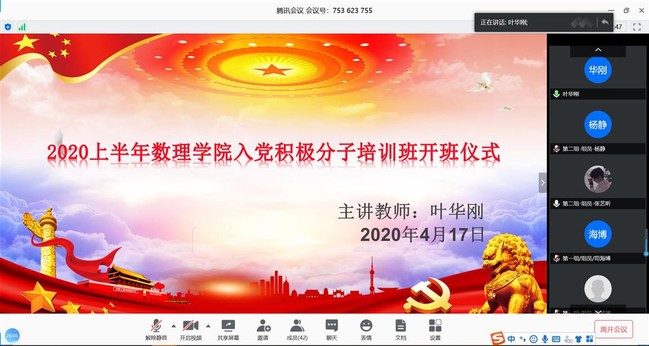 为学习贯彻习近平新时代中国特色社会主义思想,不断提高入党积极分子的思想政治素质和政治理论水平,进一步提高入党积极分子对党的认识,明确入党目的,端正入党动机,坚定理想信念,树牢“四个意识”,增强“四个自信”,我院开办2020年上半年积极分子培训班。4月17日,2020年上半年永利集团88304官网入党积极分子培训班开班仪式及开班第一讲在线上腾讯会议举行。学院党委副书记叶华刚、院专职组织员吕莹以及全体学员参加了本次线上会议。