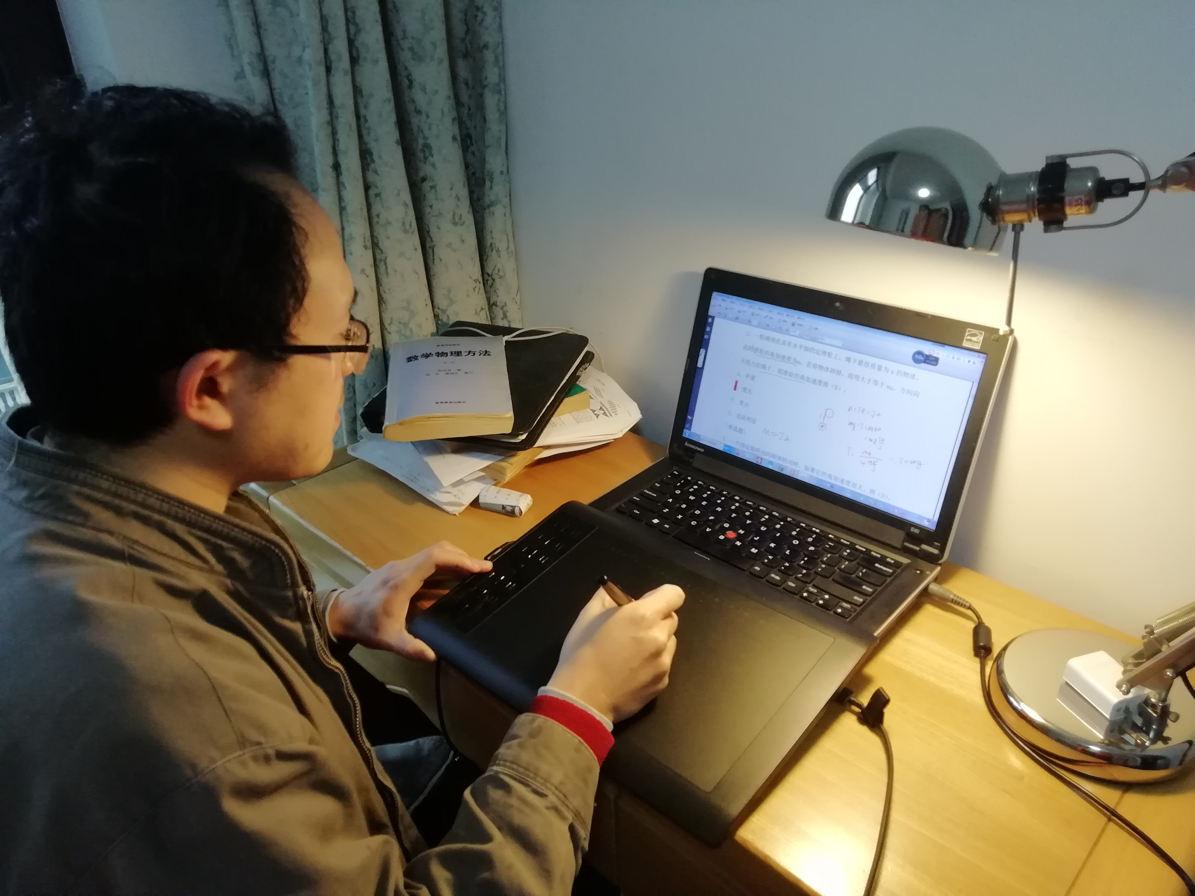 他不仅在科研上下功夫,教学上也是相当费心。当得知这学期因为新冠病毒要求老师“宅”家开始网上教学,他马上就准备了各种网课器材, 经过和学生的反复测试,最后决定还是将传统的写板书和ppt播放相结合,以腾讯课堂直播为主、录播为辅的方式将《大学物理》向大一新生娓娓道来,引导他们尽快适应大学的学习方式。
