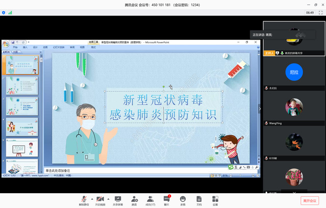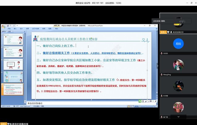 会上,学院办公室主任蒋英播放了自己录制的培训视频,进行了《新型冠状病毒感染肺炎预防知识》宣讲,详细介绍了防疫物资的安全使用、保管及遇突发情况的应急处置流程等。