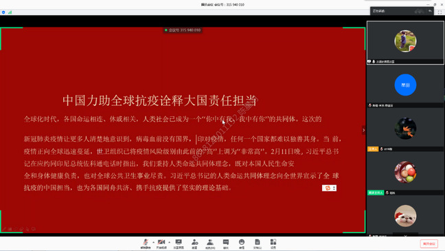 为学习贯彻习近平新时代中国特色社会主义思想,不断提高发展对象的思想政治素质和政治理论水平,帮助发展对象坚定理想信念,树牢“四个意识”,增强“四个自信”。5月8日下午,永利官网马克思主义学院苏波为我院发展对象培训班的同学们上了一堂生动的党课,主题为“疫情防控斗争中的中国担当”。课上,苏波老师以中国在全球抗疫中的责任与担当为切入点,带领培训班的学员们学习了中国坚持党的集中统一领导的制度优势。本次党课利用腾讯会议线上开展,学院发展对象培训班全体学员参加。