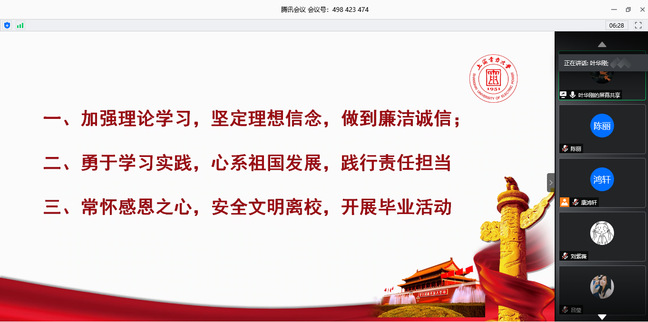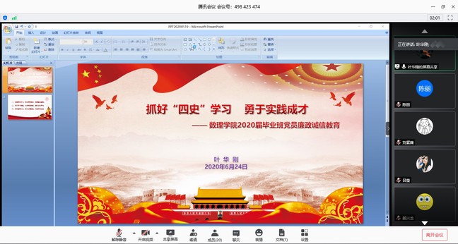 在即将迎来中国共产党建党99周年前夕,6月24日,永利集团88304官网在线上腾讯会议开展了毕业班学生党员离校教育暨党员廉洁诚信专题教育。学院党委副书记叶华刚、专职组织员吕莹、信物本科生低年级党支部书记刘紫薇、毕业班辅导员康鸿轩及全体毕业生党员参加会议。