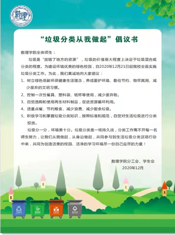 学院分工会、学生会向全院师生发出“垃圾分类从我做起”倡议书。