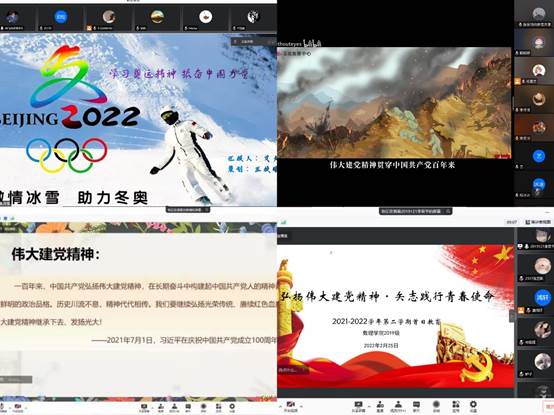 寒假期间,学生党员以“学习贯彻党的十九届六中全会精神”、“学习冬奥会精神,体悟大国担当”、“学习贯彻习近平总书记关于党史学习教育的重要指示”、“领悟百年之党史,迈进时代新征程”为主题分别进行深入学习,在易班平台“数理书苑”提交了学习感悟和微党课视频。首日教育期间,信物本科生低年级党支部和高年级党支部开展主题党日,进一步交流学习的心得体会。