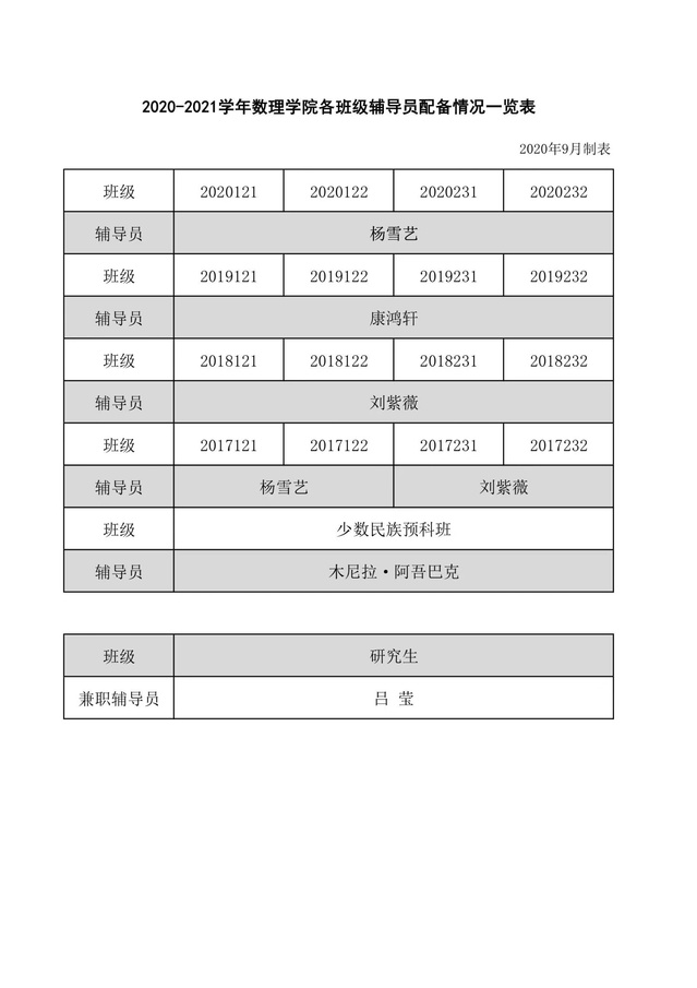 2020-2021学年永利集团88304官网各班级辅导员配备情况一览表