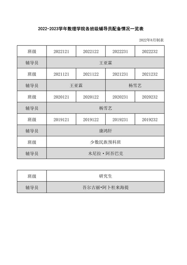 2022-2023学年永利集团88304官网各班级辅导员配备情况一览表