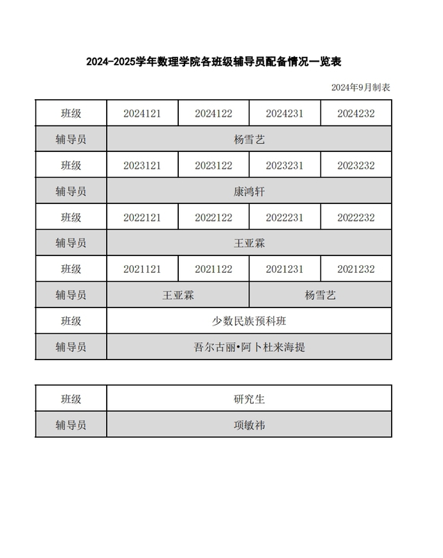 2024-2025学年永利集团88304官网各班级辅导员配备情况一览表